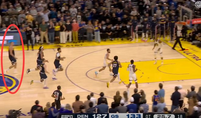 库里一溜烟加速从约基奇身边跑过,而约老师在中场竟然在慢慢的散步溜达着走,一点都没有紧迫感和要上去防守的意思,就看着库里从身边过去了。戈登都无奈了,戈登当时没放弃,掘金队友也没放弃,他还跑到约老师身边推了他背一下,想赶紧让他上去防守,但是约基奇也不上去,就看着库里在这跑。