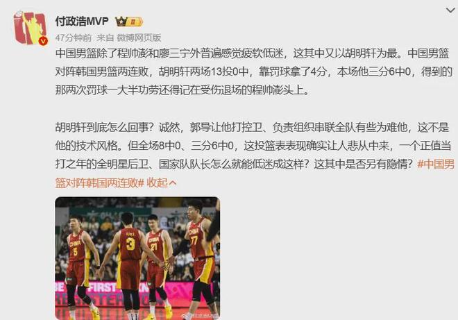 虽然中国男篮的失利不能全怪胡明轩,无奈他的数据实在太扎眼了,特别一次次让人大失所望,可能是史上首个患有“恐韩症”的球员。